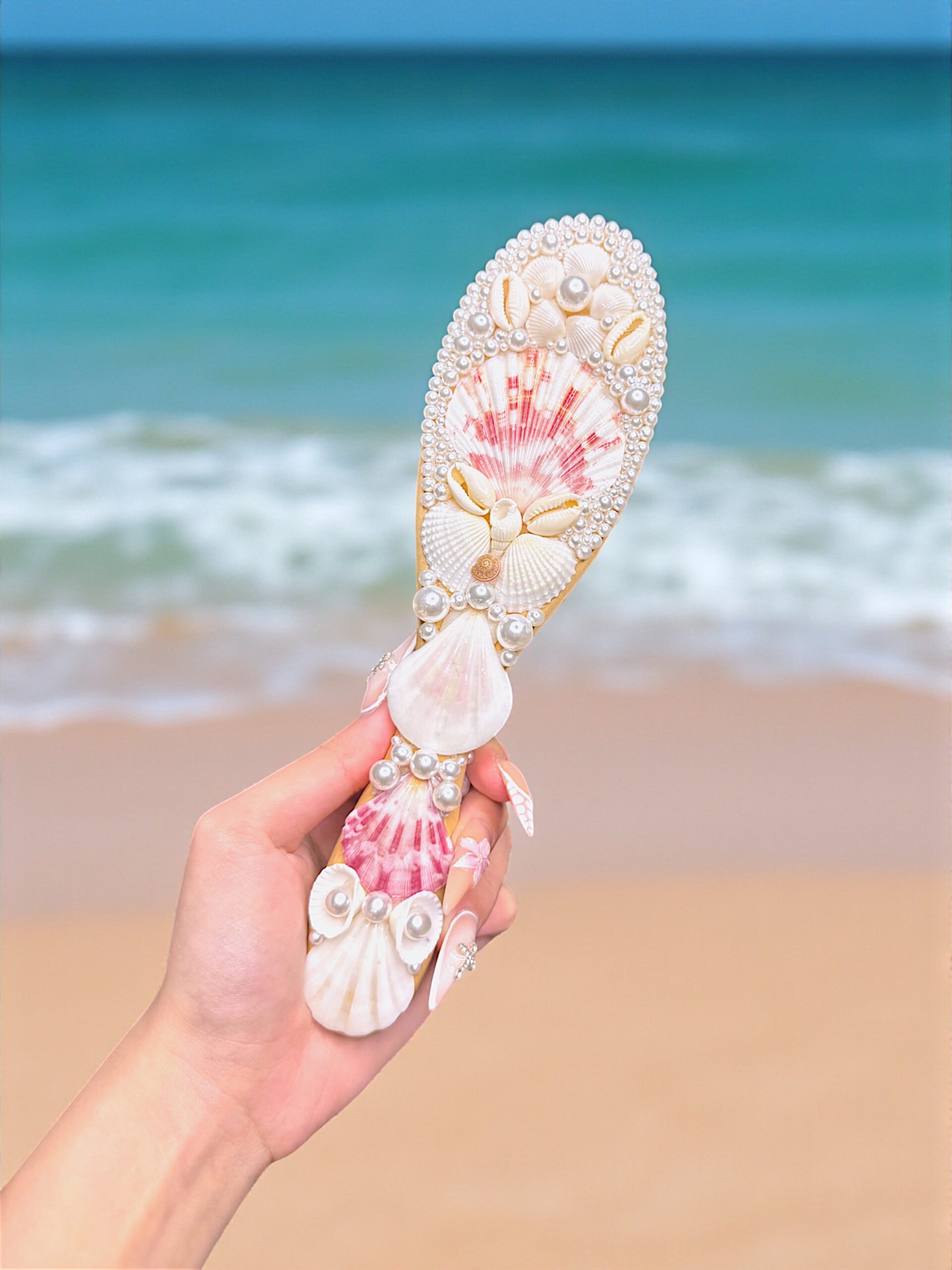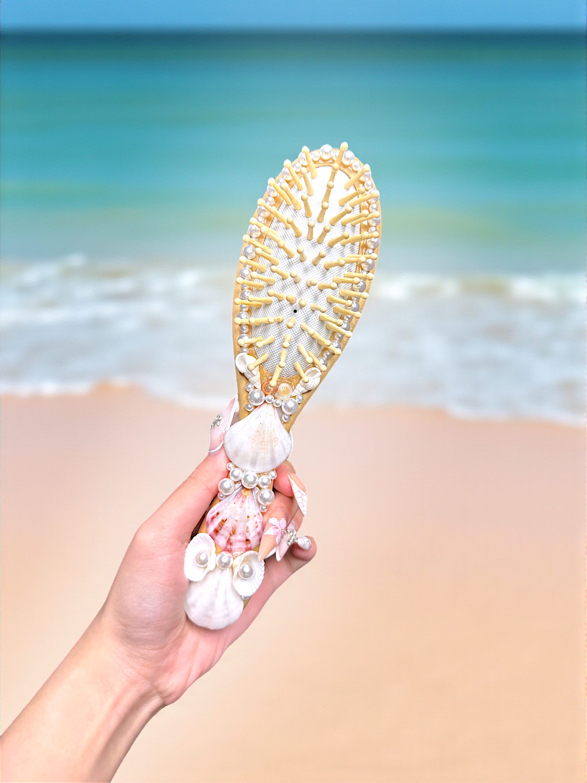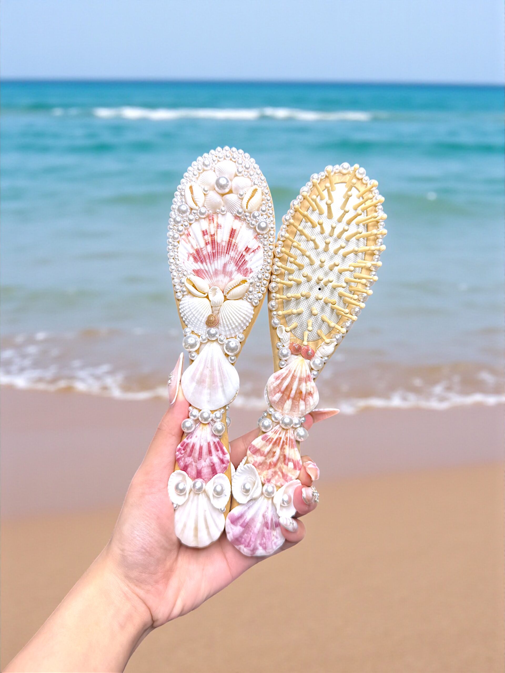 Each brush handle features a unique seashell mosaic, blending soft ivory and blush tones with delicate faux pearl accents. Perfect as a decorative vanity piece or a gentle styling tool, this brush brings a touch of coastal luxury to your daily routine.