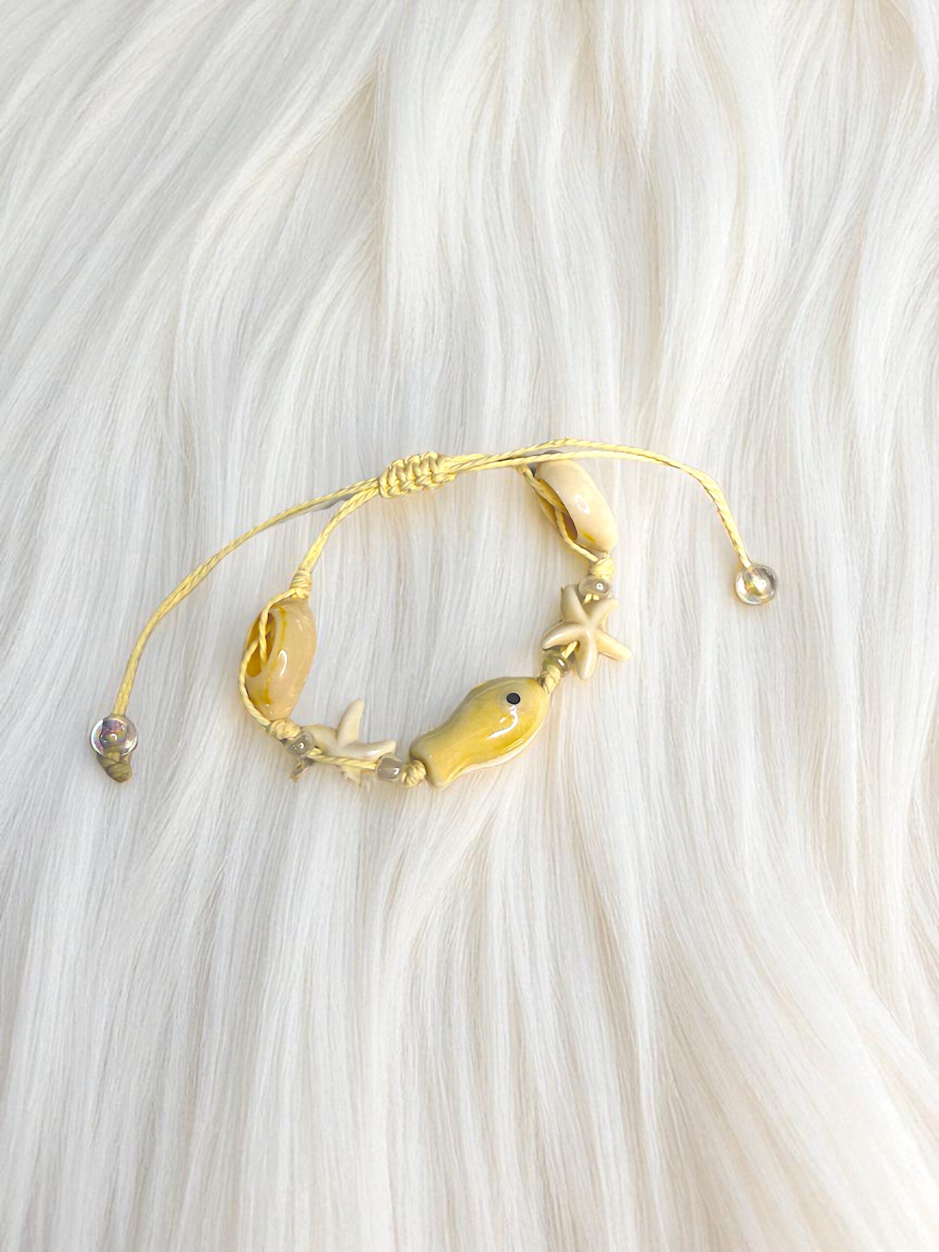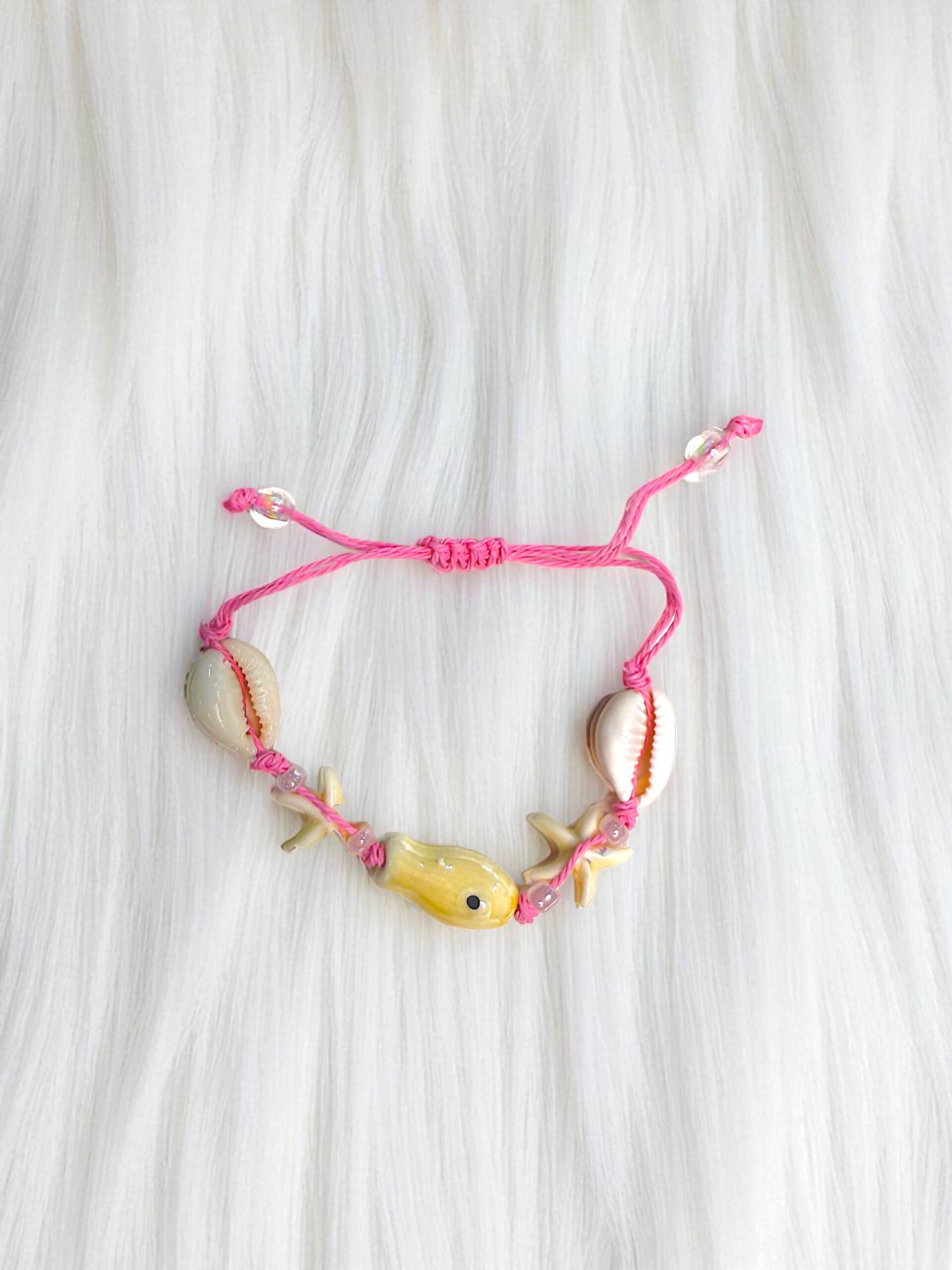 Dive into playful charm with the Coral Catch Bracelet Collection, featuring a cheerful yellow ceramic fish, natural cowrie shells, and delicate starfish charms. Hand-knotted with vibrant pink cord, this seaside treasure captures the joy of sunny days and ocean adventures. Perfect for adding a pop of color and a touch of beach bliss to any outfit.