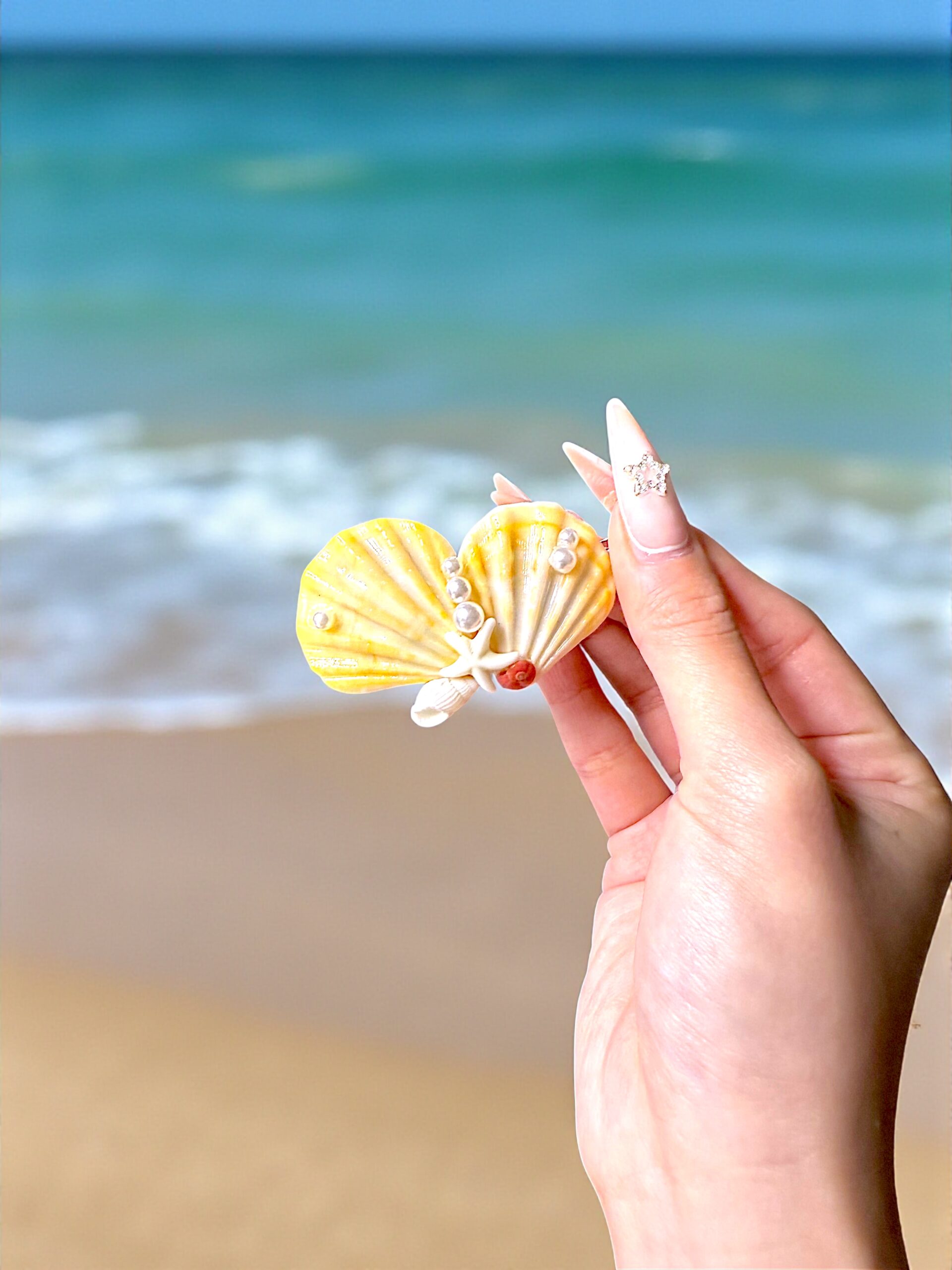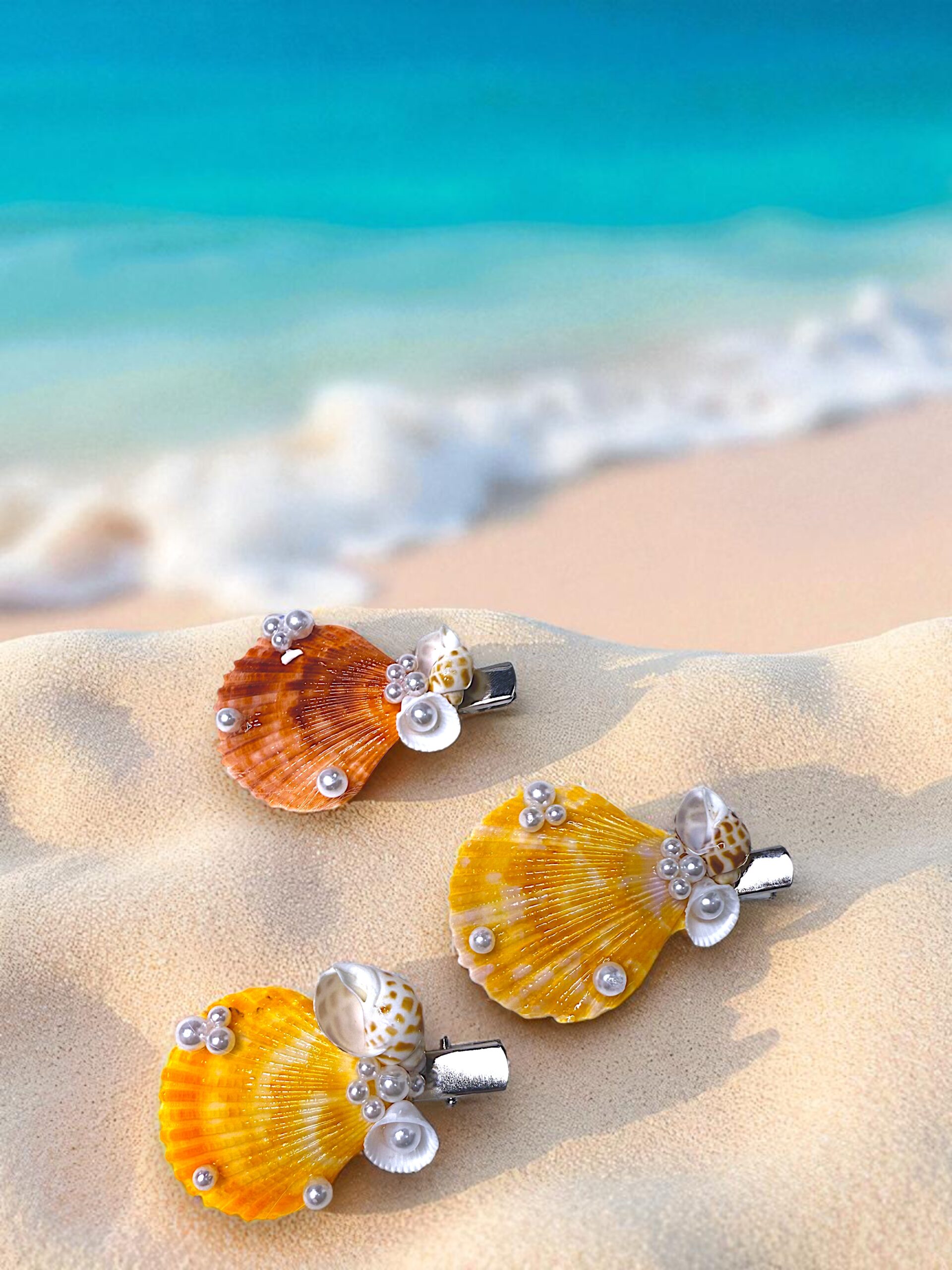 The Golden Tide Shell Clip radiates the warmth of seaside sunsets with its vibrant golden and amber scallop shells. Adorned with delicate faux pearls and natural seashell details, this handmade accessory captures the glow of the ocean’s horizon. Perfect for beach days, tropical getaways, or adding a touch of coastal glamour to your look, each clip is naturally unique — making it a true treasure from the sea.