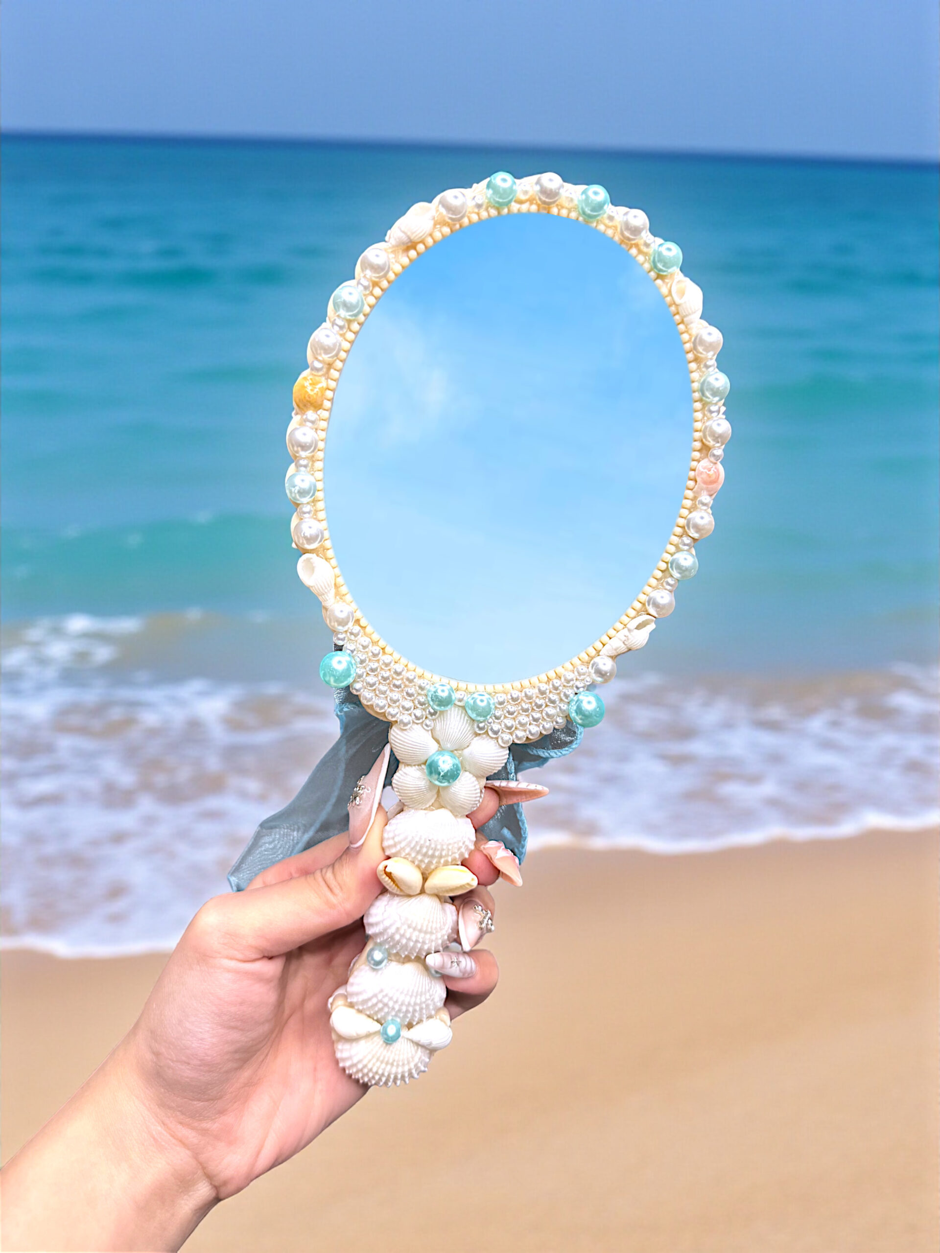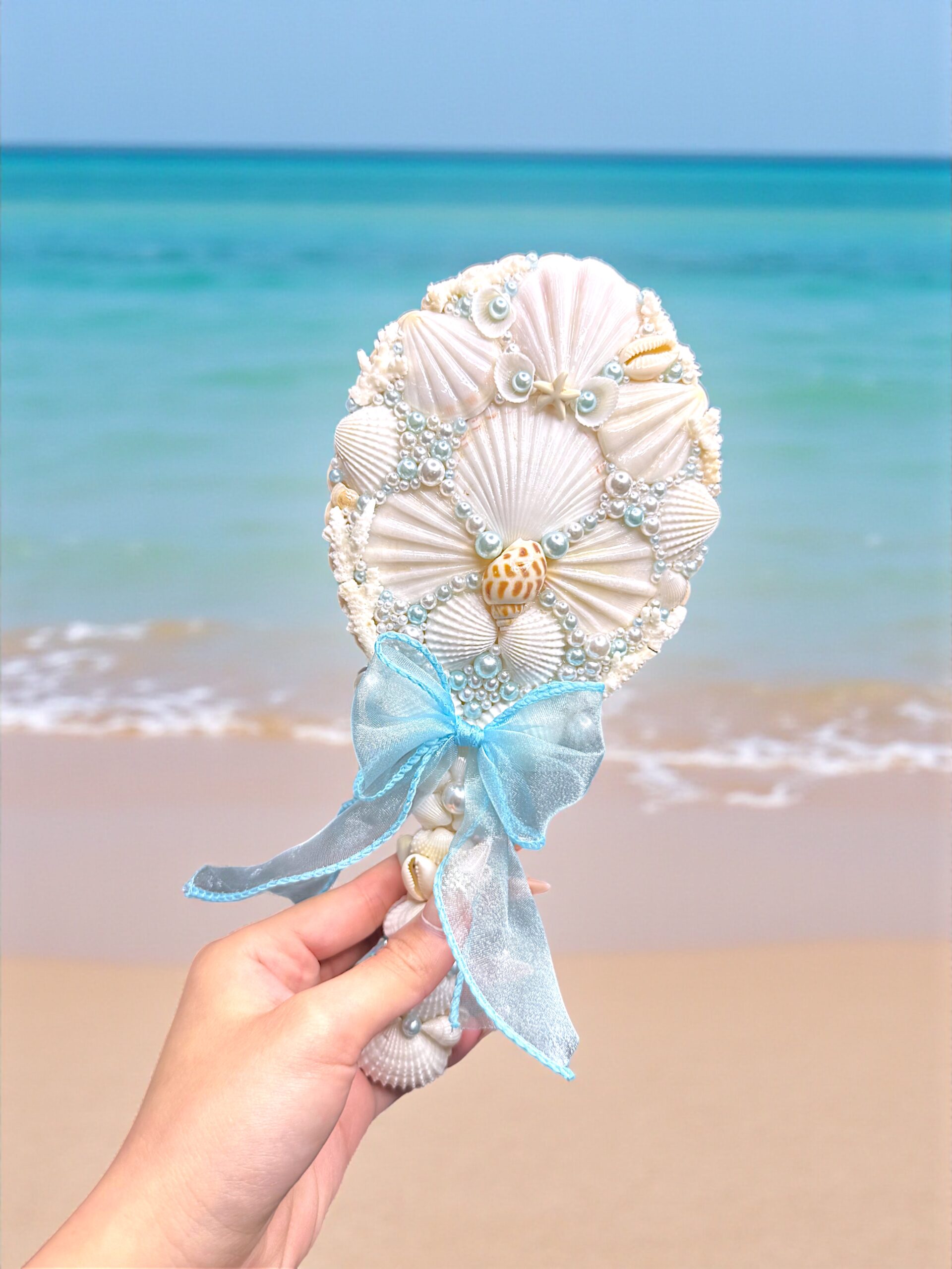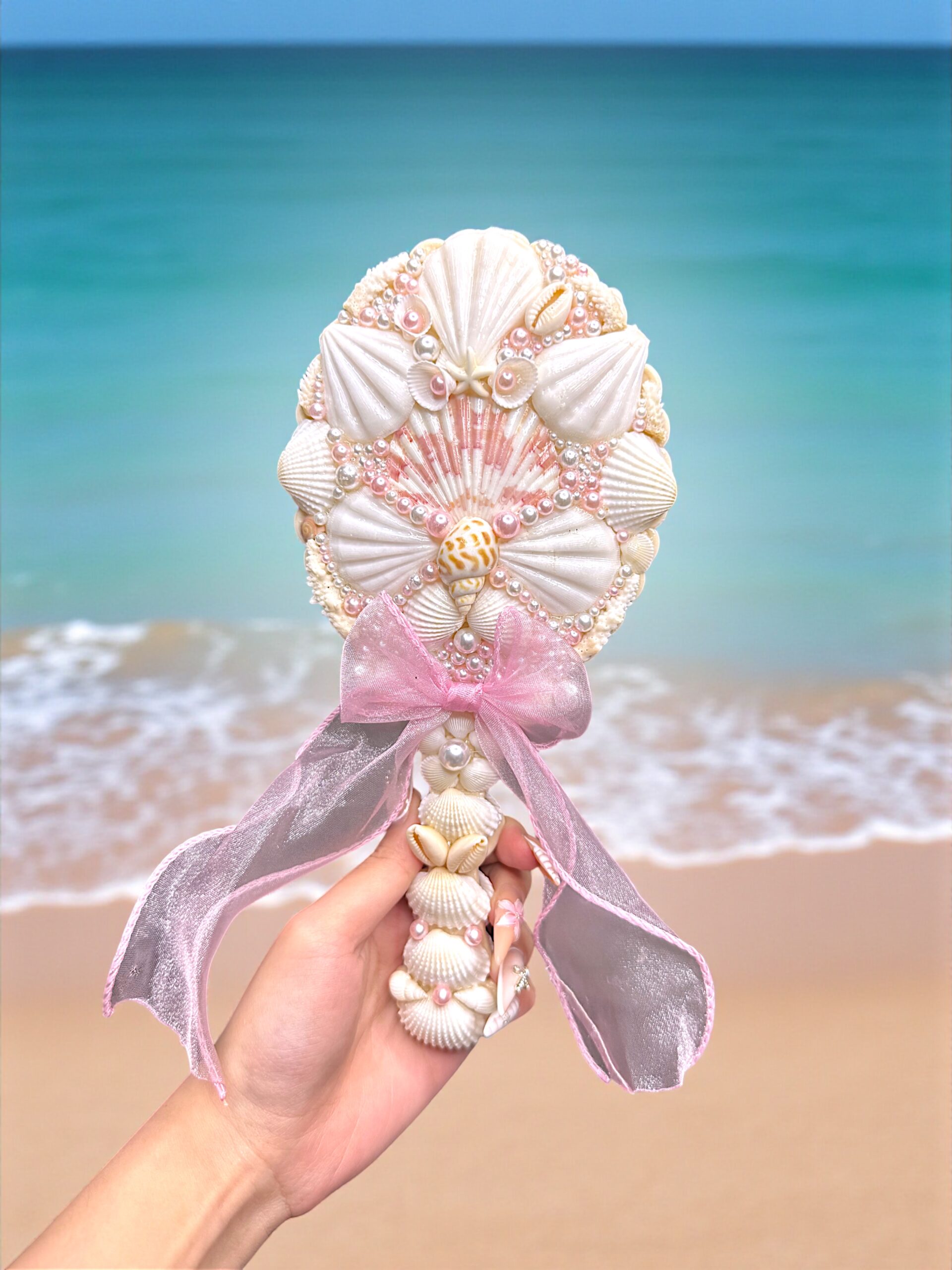 Drift into seaside elegance with ocean whisper mirror, handcrafted with imported ivory and blush seashells, aqua glass pearls, and a delicate organza bow. This romantic piece captures the tranquil beauty of the ocean, making it a perfect vanity accessory or luxury coastal gift.