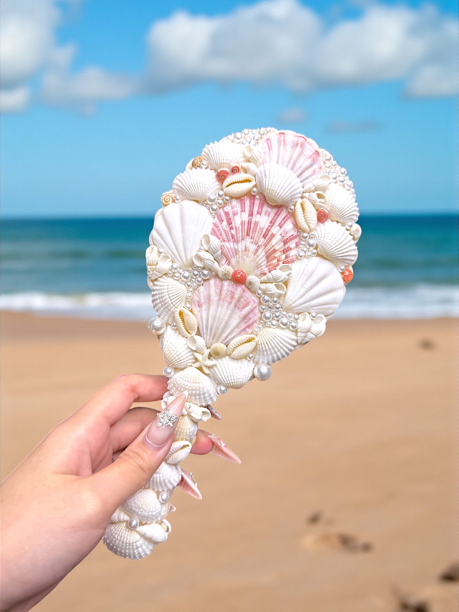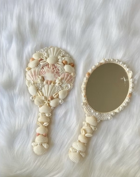 Capture the delicate beauty of the ocean with the Pearl Blossom Mirror, a handcrafted Shelloria creation adorned with ivory and blush seashells, lustrous glass pearls, and subtle coral accents. Its graceful design brings a romantic coastal charm to any vanity or dresser, making it both a functional mirror and a decorative keepsake.