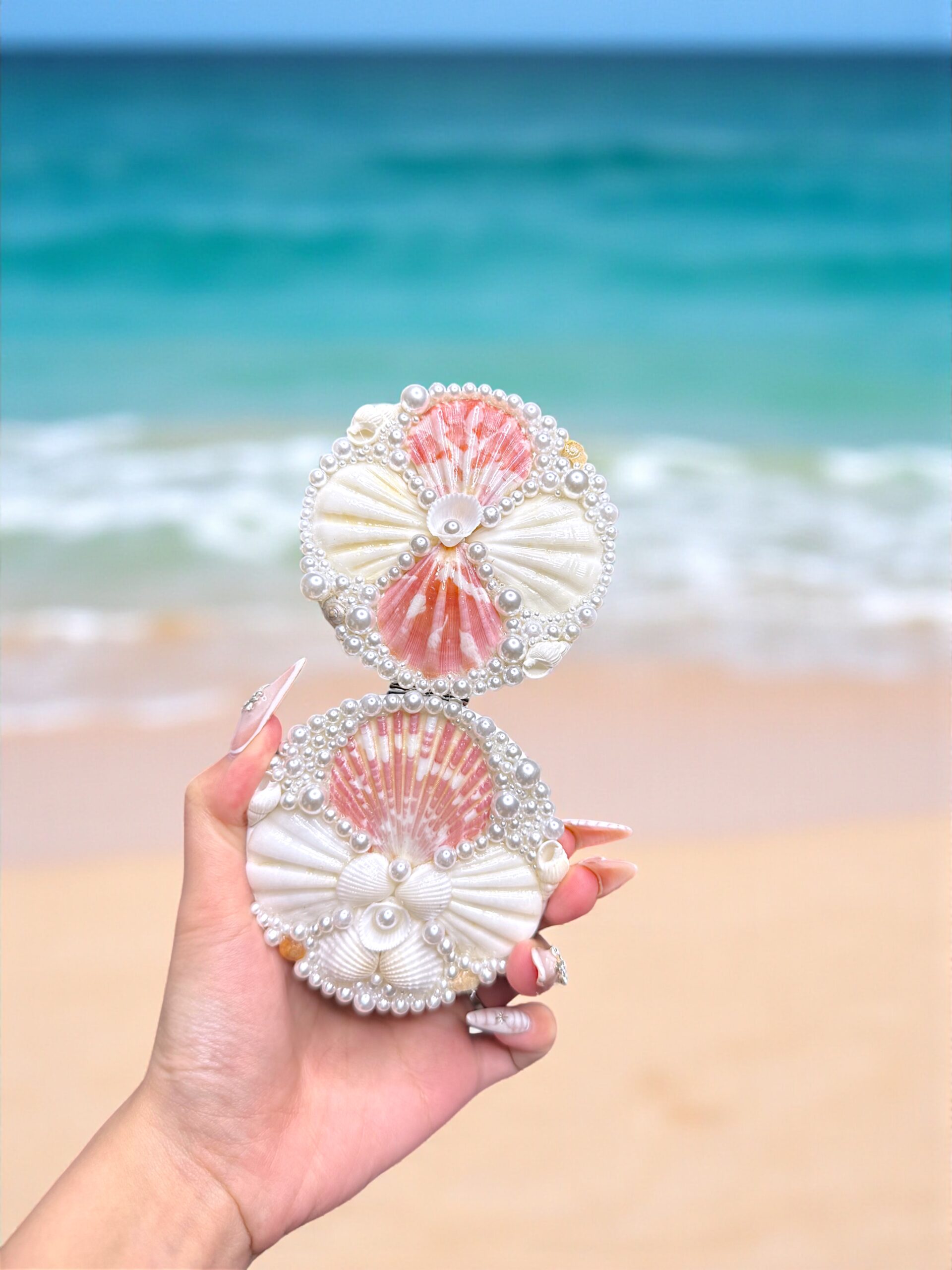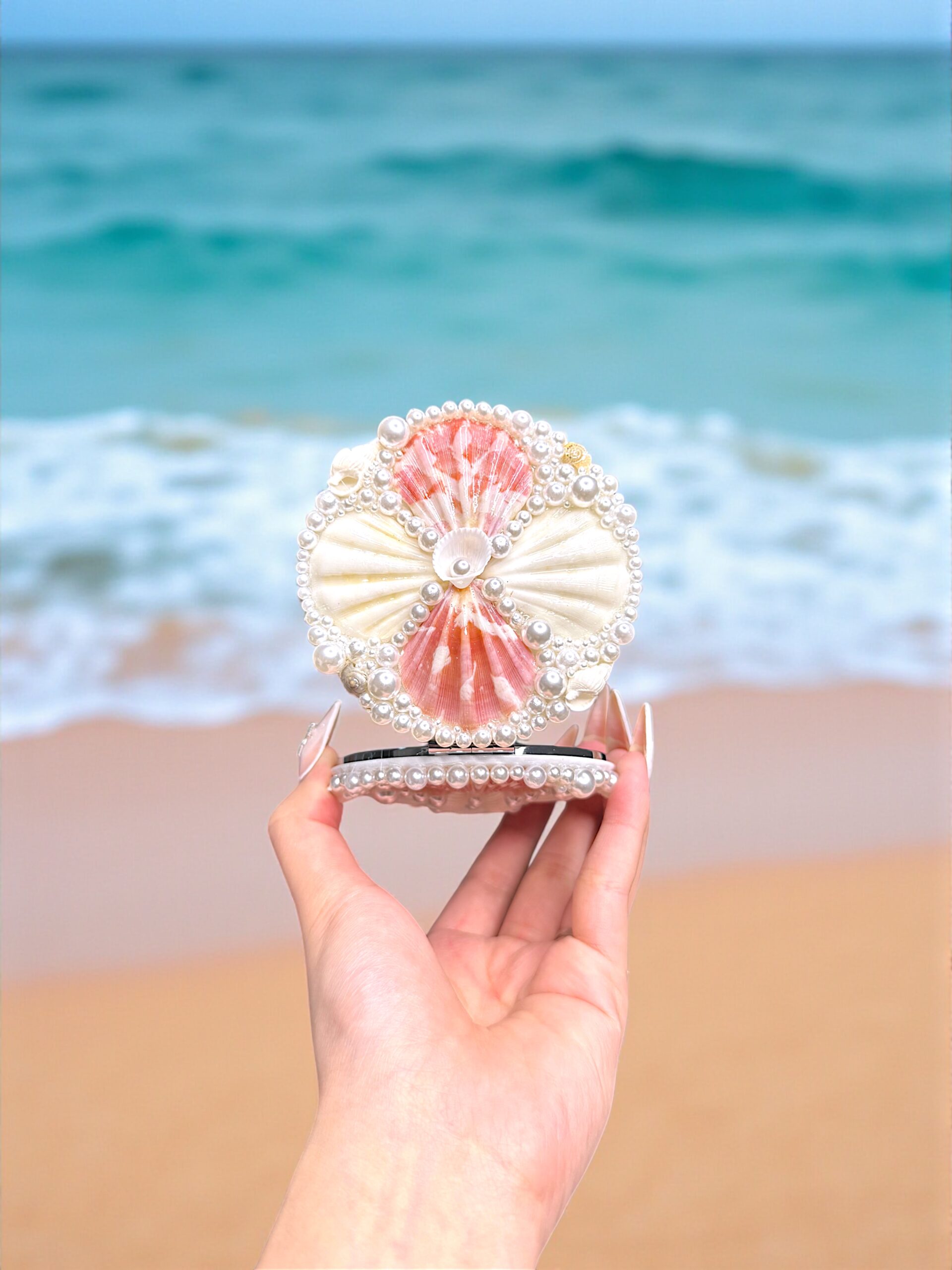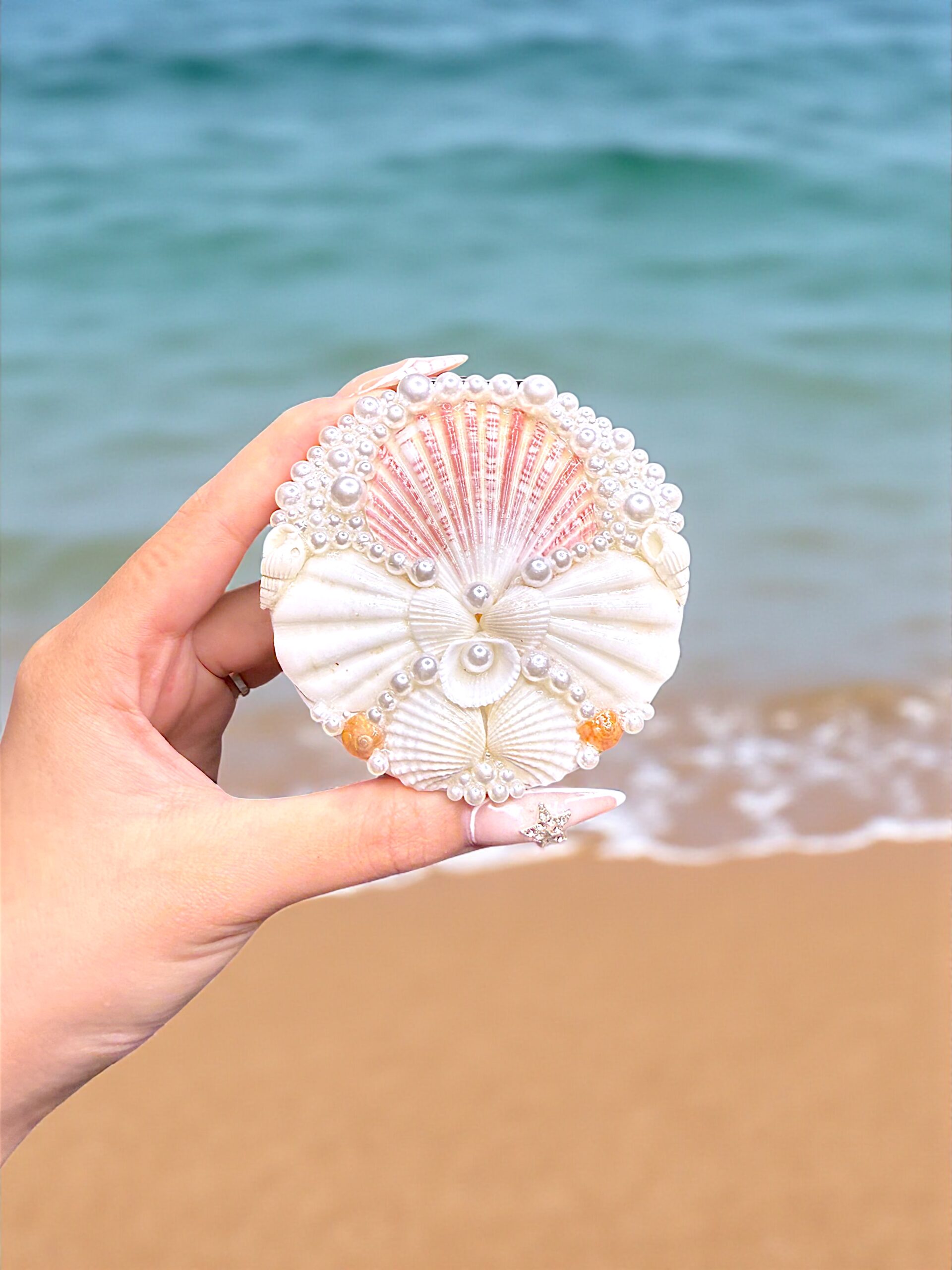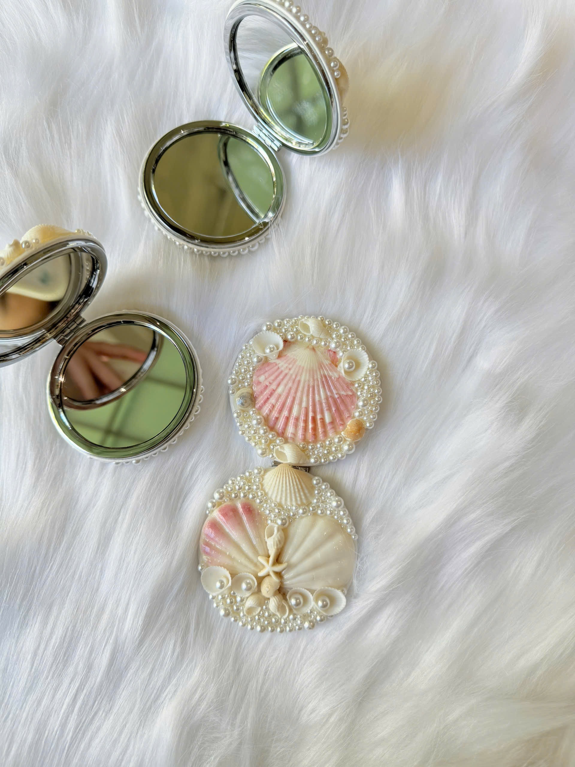 Carry the elegance of the ocean wherever you go with this handcrafted Shelloria compact mirror. Adorned with soft pink and ivory seashells, tiny lustrous glass pearls, and a delicate starfish accent, this pocket mirror is the perfect blend of romance and coastal charm.Compact and lightweight, it’s an ideal gift or travel companion, adding a touch of seaside luxury to your everyday essentials.