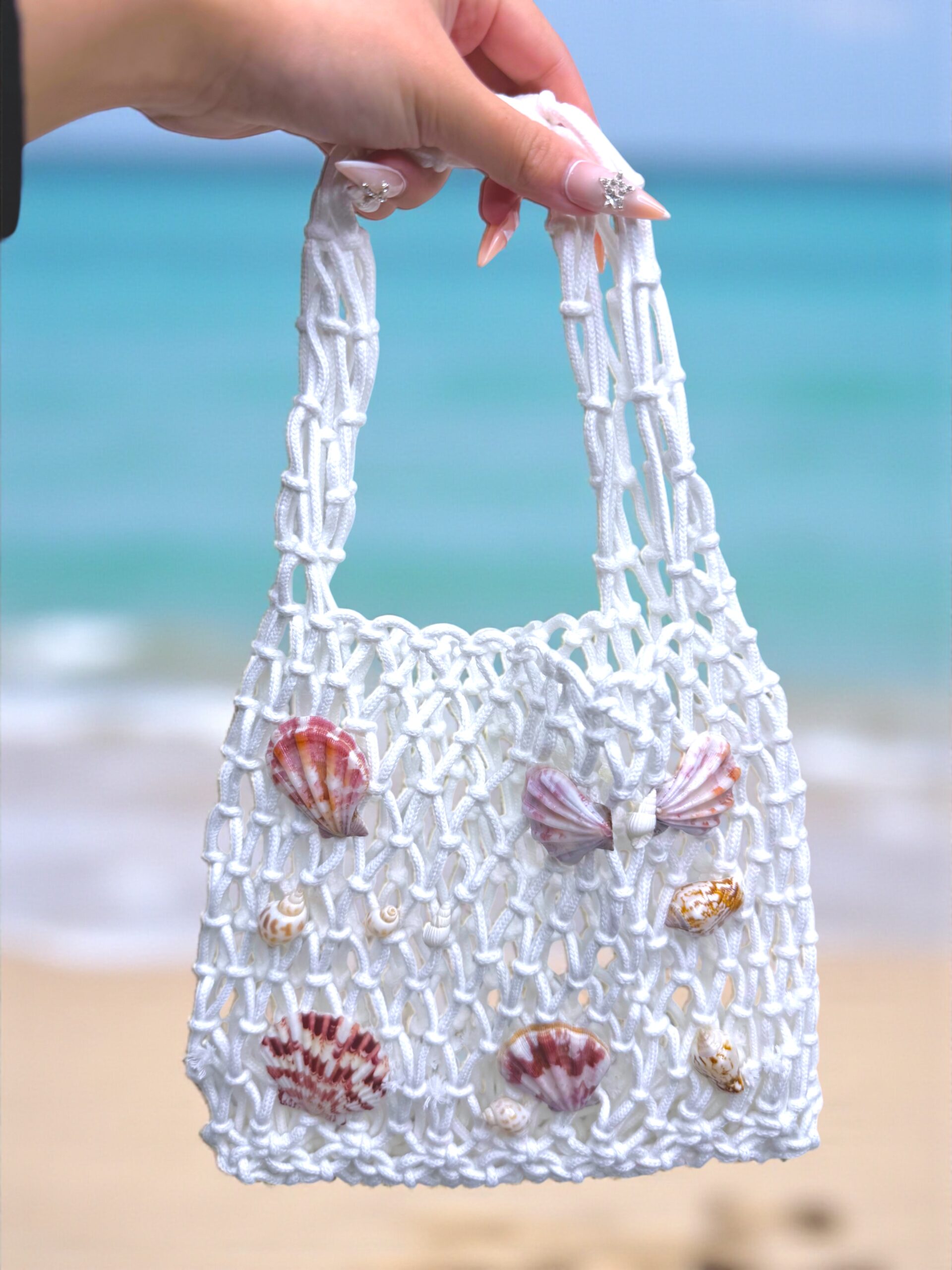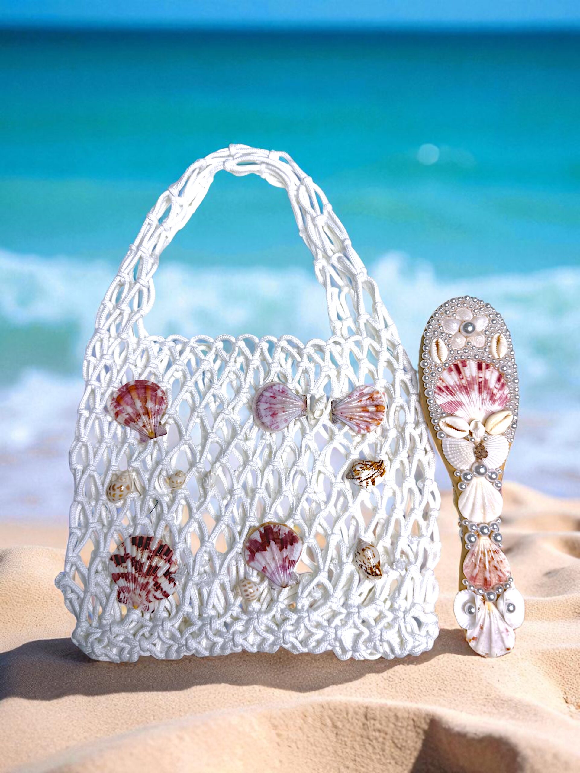 Handwoven in crisp white, the Pearl Wave Shell Tote is adorned with an assortment of authentic seashells, each carefully selected to capture the serene beauty of the ocean. Lightweight, breathable, and effortlessly chic, it’s the perfect accessory for beach days, summer picnics, or adding a fresh coastal accent to your outfit.