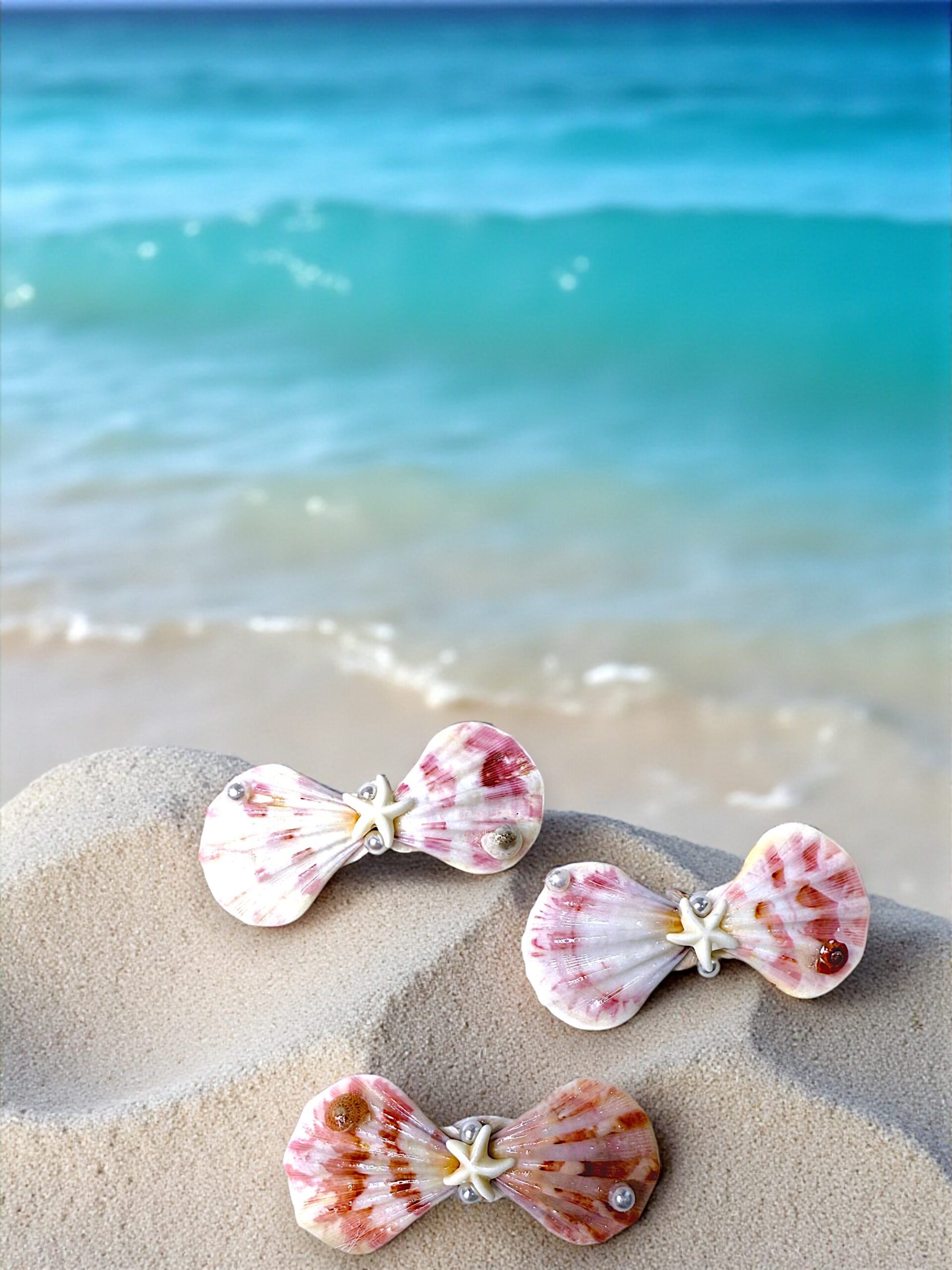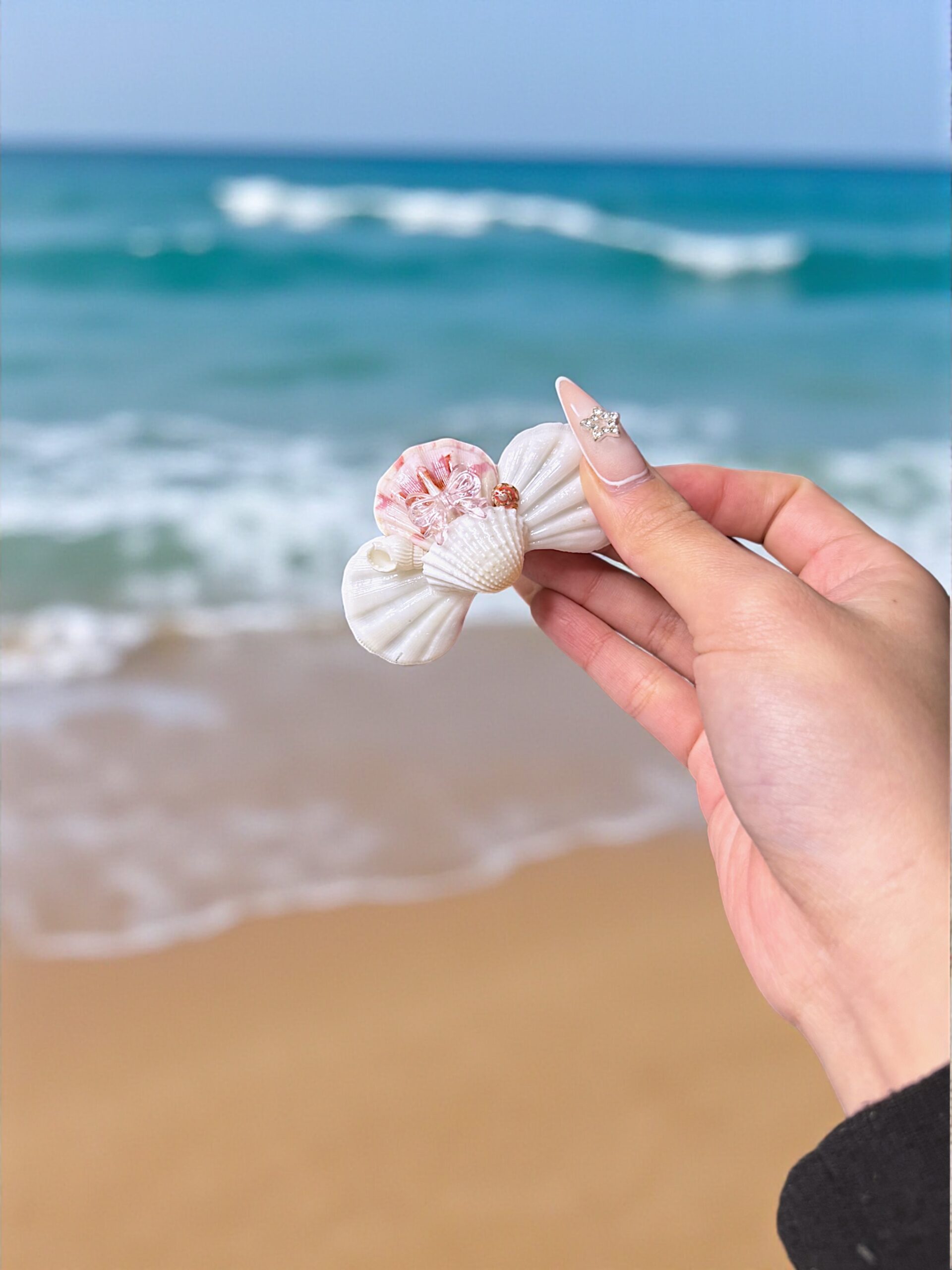 The Seashell Bow Clip is a charming handmade accessory crafted from natural shells, delicately arranged to form a graceful bow shape. Enhanced with soft pink shell accents and a touch of coastal shimmer, it embodies the elegance of ocean treasures. Perfect for beach outings, summer events, or adding a unique seaside flair to your look, each clip is naturally one-of-a-kind, making it as special as the sea itself.